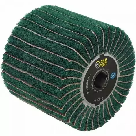 Brosse fibre synthétique grain A240 et lamelles abrasives grain A120 Ø120mm – L100mm pour poncer/polir/satiner le bois ou le métal (surfaces complexes ou planes). Compatible avec machines REX120C, REX200 et REX-H-200.