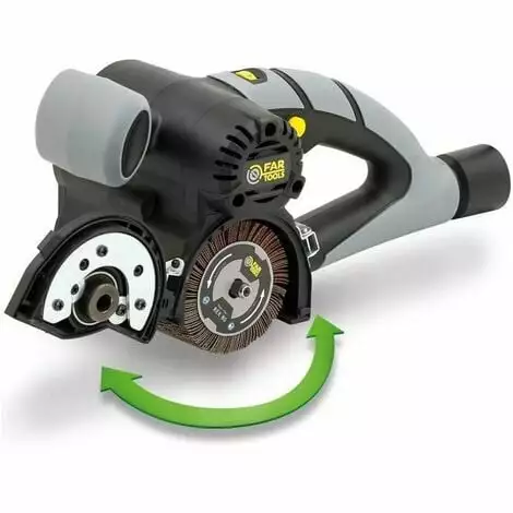 Rénovateur compact multi-matériaux 420W – Compact et léger Utilisable a 1 ou 2 mains – Pour décaper/dégriser/nettoyer/satiner/polir tous types de matériaux : bois, métal, pierre, béton, etc. – Vitesse variable de 1000 a 3200tr/min pour s’adapter au matériau travaillé – Changement de brosse ultra-rapide et sans outil